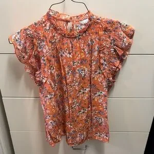 Bright orange blouse with floral pattern. Features ruffle sleeves and a stylish design.