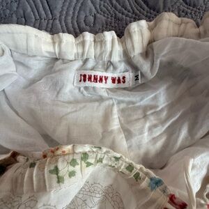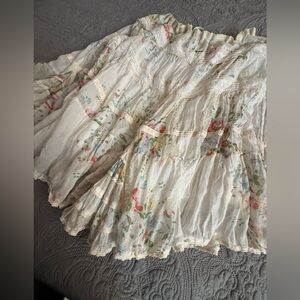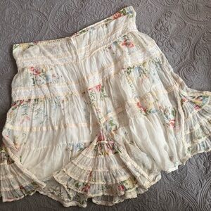 Charming Johnny Was A-line skirt with floral design. Features a flowy silhouette, fanned hem accents, delicate lace touches and drawstring waist. Ideal for a feminine touch! Size Medium🎀