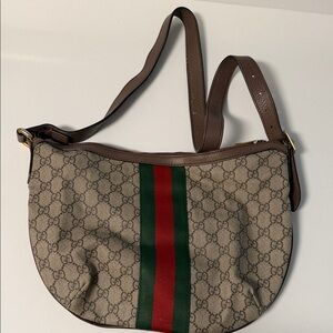 Elegant Gucci shoulder bag featuring iconic beige and brown pattern. Accented with green and red stripe. Perfect for a chic look. There is a tear on the inside of the bag.