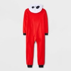 Cozy red onesie with a skeleton design and hood. Perfect for lounging or costume wear.