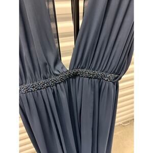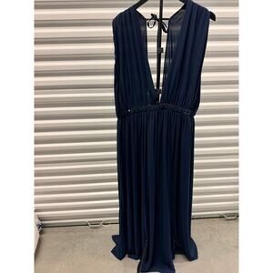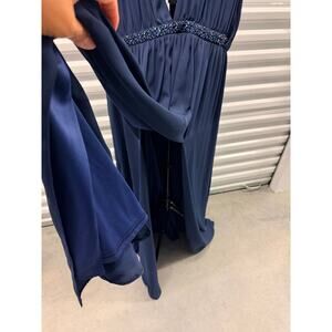 Discover this elegant Asos Navy Goddess Plunge V-Neck Maxi Gown, a truly beautiful piece perfect for special occasions or evening events. This flattering dress, size 14, features a chic empire waist design and plunging V-neckline, front slits over both legs