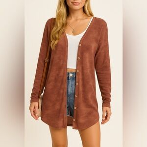 Coastal Cowgirl, Soft Minimalism, Elevated Basics, Cozy Chic, Lived-In Lounge, Z Supply cardigan, mineral wash cardigan, waffle knit sweater, rust cardigan, oversized soft cardigan, button front knit, casual layering piece, boutique style, fall neutral, warm tone knit.