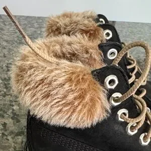 Black boots featuring tan fur trim. Rugged soles for traction. Ideal for winter wear.