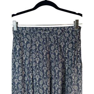 A versatile navy skirt with intricate bell designs, ethically made with lightweight rayon fabric. Suitable for casual or semi-formal wear. Box pleats hang from waistline to hem, dainty bow in the middle of the waistband in the front.
