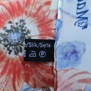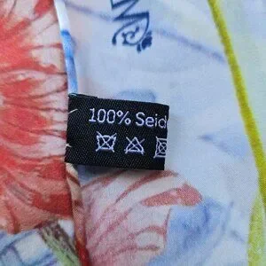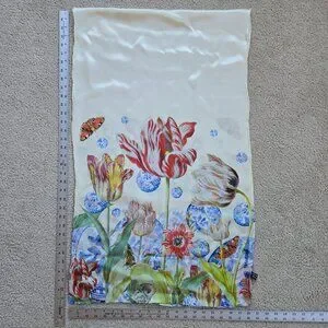 Madame Blue is based out of the Netherlands and sells delftware and accessories. This silk scarf with tulips has hand-rolled edges. Please note, there are a few faint makeup smudges on the white part. It's been my experience that these almost always come out with a little spot cleaning, but this is not guaranteed. No other issues to disclose.