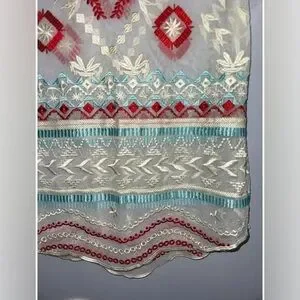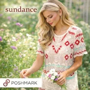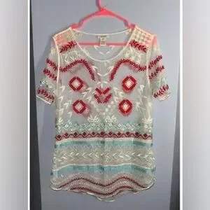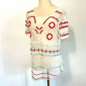 Sundance Sheer Embroidered Boho Tunic Blouse Southwestern Folk Art Top Size Small Sundance, Chic sheer blouse with intricate embroidery. Perfect for layering. Size Small, Sundance sheer boho embroidered short sleeve top in cream with red and turquoise stitching. This lightweight mesh tunic is designed for effortless layering — perfect over a neutral tank, slip dress, or swimwear. The detailed embroidery and scalloped hem give it that signature Sundance artisan, boutique feel that elevates even simple denim.