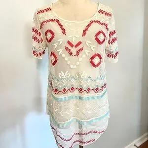 Sundance, Sheer Embroidered Boho Tunic Blouse Southwestern Folk Art Top Size Sm