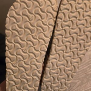 Tan sandals with pink floral embellishments. Stylish and comfortable design. sandals are in excellent cond but each shoe has one of the snaps broken on the flower that snaps on
