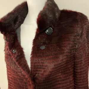 Lightweight dyed mink coat link in gray poly. Black button detailing at the neck and stand up collar. Front pockets. Merlot color way. Fur imported from Denmark. New condition.