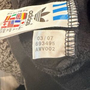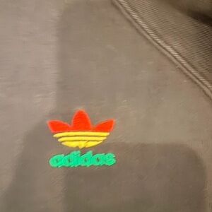 Cozy black hoodie with vibrant stripes. Features classic Adidas logo. Ideal for everyday wear. Faded but good clean condition.