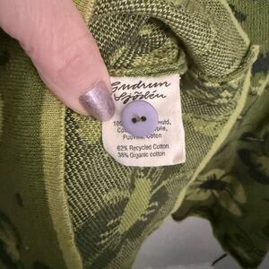 Elegant green sweater with floral design. Buttons at the front Organic Cotton/ Recycled Cotton In great pre loved condition Last pics with measurements taking with flash Approximate Measurements While Laying Flat Size M