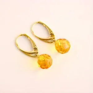 These amber earrings feature faceted lemon amber gemstones set in 14k gold plated sterling silver and finished with a secure lever back closure. The faceted stones enhance the natural brightness of the amber, allowing light to move clearly through each surface. Designed with a balanced drop and refined proportions, these amber earrings present a polished, focused look.