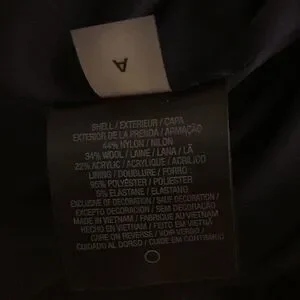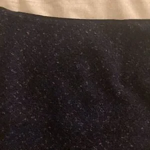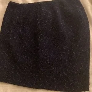 Elie Tahari navy tweed nubby wool blend skirt with flat front, no waistband, back zipper closure, slanted hem and side pleat. Skirt is fully lined. 44 nylon, 34 wool, 22 acrylic.