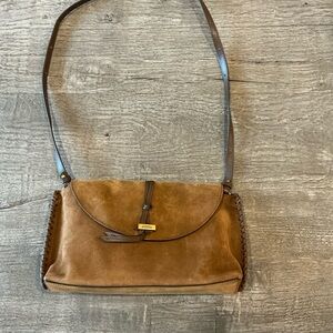 Suede shoulder bag with leather stitching detail. Professionally cleaned but never worn. Excellent condition with tags. Small inner pocket. Lined in canvas.
