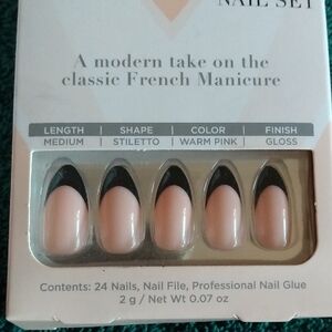 Vibrant French nail set with pink, purple, and yellow tips. Includes glue and accessories.