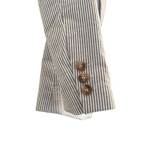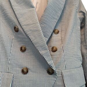 Elevate your style with this chic striped double-breasted blazer. Perfect for any occasion, this blazer offers a sophisticated look with its classic design. The subtle blue and white stripes add a touch of elegance to your wardrobe.