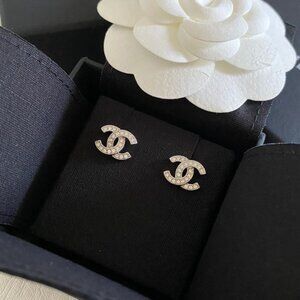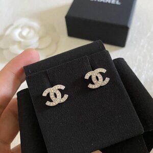 Dazzling CHANEL earrings with crystal accents. Iconic logo design. Adds sophistication to any look.