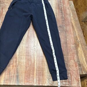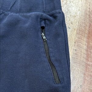These zipper pocket joggers from Uniglo have zipper front pockets, one zippered back pocket, an elastic waist and cuffed bottoms. Navy blue with black zippers. They are Men’s M but can fit a S man, M woman or tall kid. Measurement in photos.