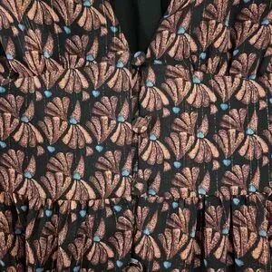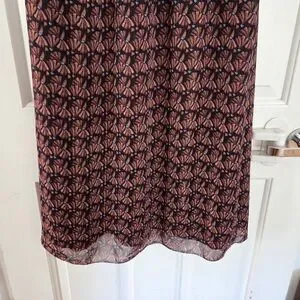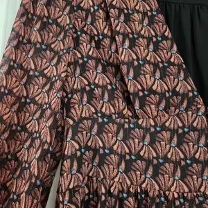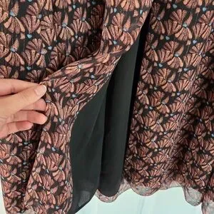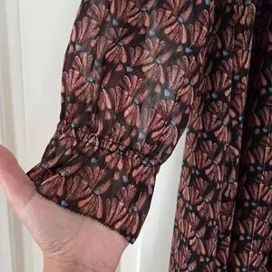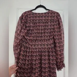 Whimsical long sleeve dress with a black and pinkish purple pattern. Sleeves are sheer and dress features a flattering v-neck and button down style. Extra button included. Front slit up to the knee and the skirt is lined.