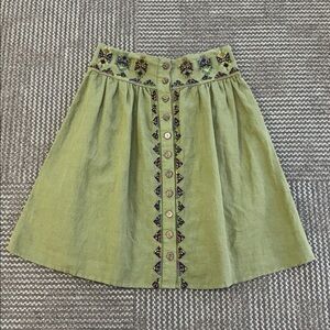 Such a cute skirt from Anthropologie- the embroidered utility skirt buttons down the front and features embroidery at the waist, down the front by the buttons, and along the back. Has an elastic panel at the back of the waist. Fully lined. Size 10. New with tags.