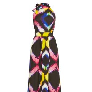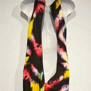 Multicolored tie dye viscose (100% Viscose). Midi. Mock neck. Sleeveless. Side zipper closure. 52" from shoulder to hemline. Imported.