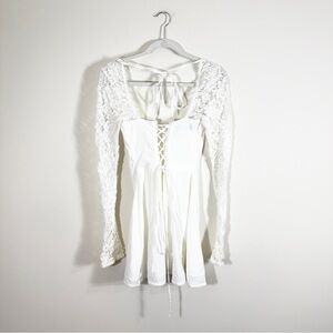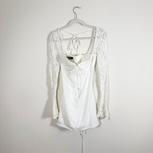 Excellent preowned condition womens size medium. Ivory white mini dress made in luxury stretch floral lace with long, flared sleeves, a cupped bust and tie detail. Milkmaid inspired design.