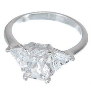 The total weight of this lady's ring is approx. 2.0 ct. The center stone is 1.0ct in a Emerald Cut, accented on each side by 2 Emerald Cut created stones.