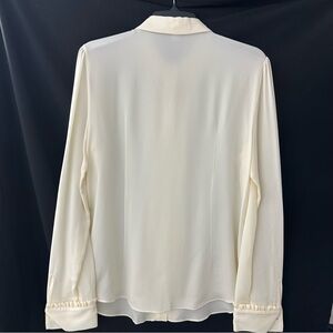 Elegant cream blouse with ruffle detailing. Button-up front. Long sleeves with buttoned cuffs.