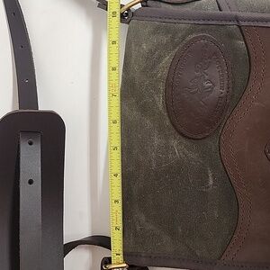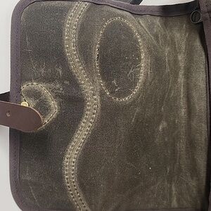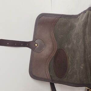 This unisex distressed Frost River Reliable Softgoods Duluth Minnesota crossbody field satchel messenger saddlebag features a sophisticated olive and brown design, perfect for everyday use. Crafted with attention to detail, it offers both style and functionality. Pre-owned in good condition. Quality leather and waxed canvas. Adjustable thick leather brown should strap. Gold hardware. Measurements in pictures.