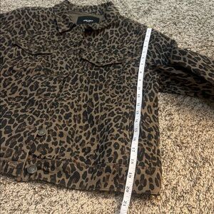 Stylish leopard print jean jacket. Features classic button-up design. Perfect for a bold statement. Measurements in pics.