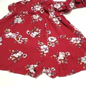 Burgundy short sleeve romper with a floral print. True wrap top on front and back. Ties on the back of the neck. The wrap has a beautiful lace on front a nd back. Elastic waist. Flowy shorts. 100% rayon.