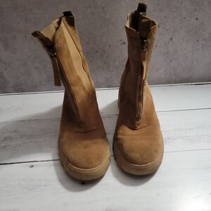 The GABOR suede boot features a lug sole heel, a zipper up front, and gored sides. Style has removed insole, 2 1/2"heel approximately 1" platform front.
