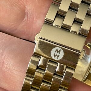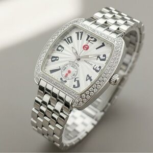 This watch is in excellent preloved condition. It has been recently tuned up by my jeweler and has a new battery as well as a new stainless steel Michele watchband. The face is pristine.