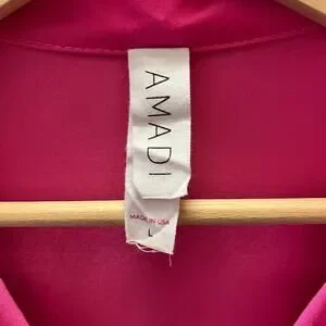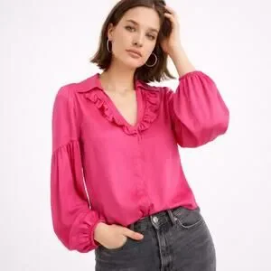 This AMADI Lara Ruffled Blouse, originally sold at Anthropologie, features a vibrant hot pink hue with romantic ruffle detailing along the V-neckline. Made in the USA, this lightweight woven top drapes beautifully and adds a statement pop of color to any outfit.