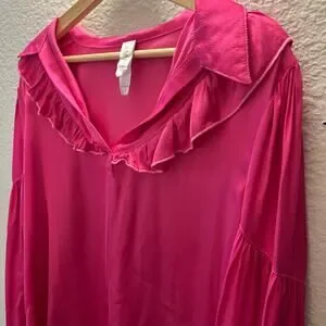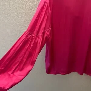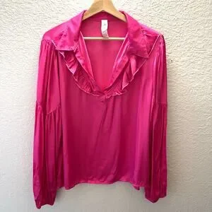 AMADI Lara Ruffled Blouse Hot Pink Anthropologie Boho V Neck Long Sleeve Size L