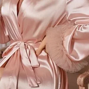 IZA Lingerie & Loungewear presents The Most Glamorous Pink Silky Satin Smooth Belted Bath Robe Kimono With Mesh Ruffled Trim NEW. Absolutely gorgeous & luxurious.. This will be the one you leave hanging on a pretty hook in your bathroom 🥹🎀 ! So smooth & silky. Well made & with quality fabrics of satin polyester & Elastane spandex blend . Looks like icy silk! The prettiest shade of pink .