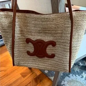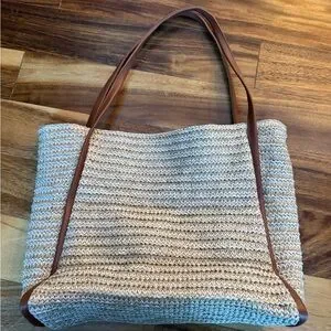 Stylish woven crotchet tote bag in a chic brown and cream design. Perfect for everyday use with a spacious interior. Elevate your style with this versatile accessory. Soft woven fabric gives it a straw tote look, interior, vegan leather trim and handles. Brand new, never used. Approx. 15in wide and 11in tall