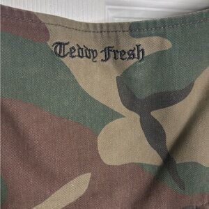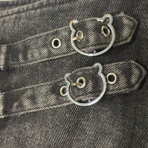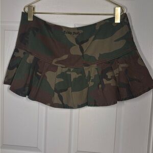 Low rise pleated mini skirts by Teddy Fresh. Includes a black pleated skirt with buckle accents and a camouflage pleated skirt with buckle details. Perfect for casual outings.