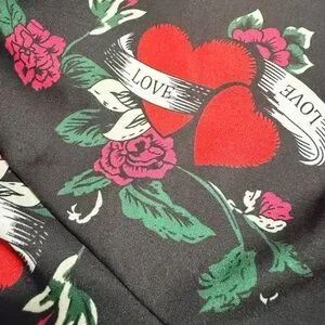 Romantic black one-piece jumpsuit featuring an allover heart and rose print with “LOVE” ribbon accents.