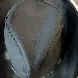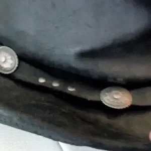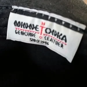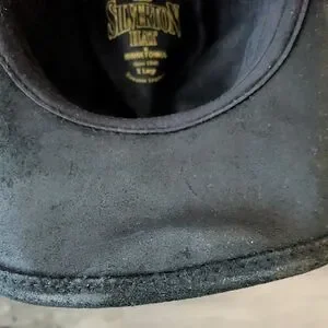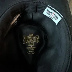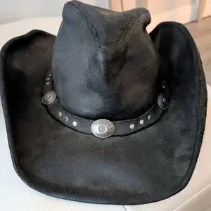Beautiful Minnetonka Black leather cowboy Western hat with silver concho embellishments size XL Women but also unisex. In very good condition just the adjustable wire on the inside front of the hat is sticking out but can be easily fixed. I purchased it for my hubby but it's a little too small. The black leather is a rough leather this hat has never been worn only tried on. Please see pics for measurements as well. Classic black western hat with silver embellishments. Ideal for a bold, stylish look