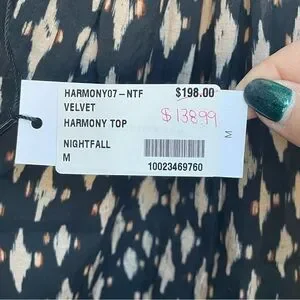This is a Velvet by Graham & Spencer brand v-neck blouse / top in a women’s size Medium. This style of blouse is called the Harmony blouse and the fabric color is Nightfall. Top is brand new with its original tag attached.