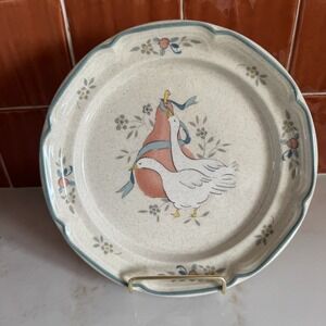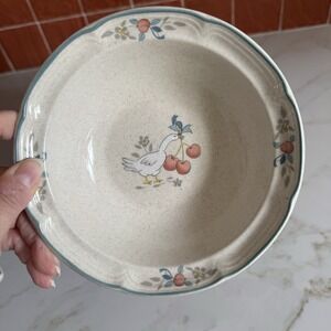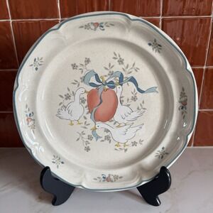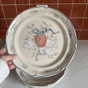 Charming vintage stoneware plate set featuring a sweet country goose duck motif with apples, cherries, florals, and soft blue ribbon details. This coordinating set of 12 piece includes 4 each of dinner plates, salad/dessert plates and bowls. Each piece has a scalloped edge and a warm cream background with subtle speckling.