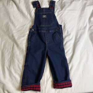 Charming dark blue overalls by OshKosh B'gosh. Features red plaid accents and adjustable straps. Ideal for playful days.