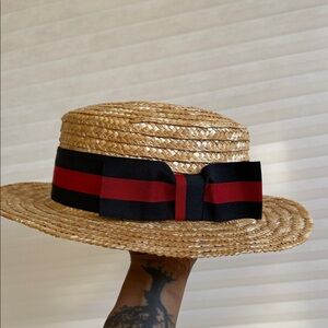 Vintage Straw Boater Hat | Black & Red Ribbon | Classic Skimmer Style