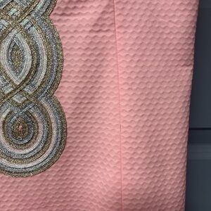 Such a happy dress! Pretty pink “embossed” cotton with metallic trim. Hand washable. Size 6. No visible flaws or stains.