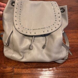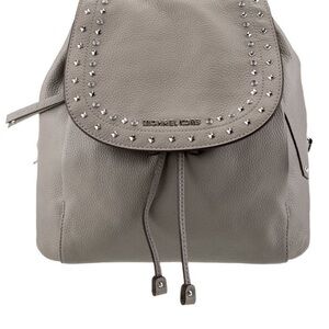 This is a Michael Kors Riley studded pebbled leather backpack in a grey color. Missing one stud on the front