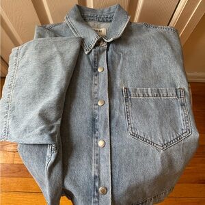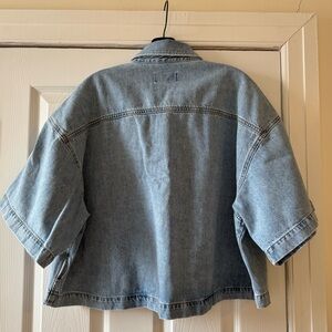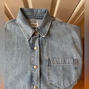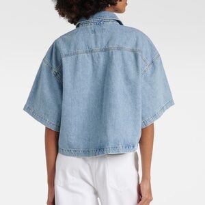 New without tags. Size Medium. Agolde short sleeve Rona denim button up box shirt in light wash effect. Designer color name: Effect. Snap button placket. Designed with an oversized, boxy silhouette, a dropped shoulder into extended short sleeves and with cropped hem. Angled chest pocket. 100% regenerative cotton. Made in Turkey with imported materials. Measurements approx: full length 21/22"in, pit to pit 25"in.
