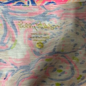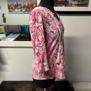The perfect summer and vacation top you will love! From designer Lilly Pulitzer, this vibrant top pairs with shorts, slacks or a mini! Beautiful sea theme with 2 tassel’s with a V-neck front.