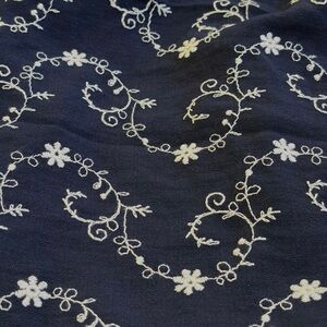 New with tags Francesca’s by Blue Rain women’s navy blue floral dress with white floral embroidery. Designed with puff sleeves, side pockets, a structured milkmaid-style bodice, and an open back with bow tie closure.