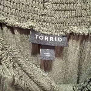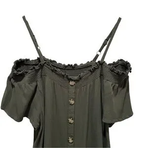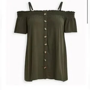 Torrid Smocked Cold-Shoulder Olive Green Rayon Blouse Size 1X. Button front, adjustable straps. In excellent condition!